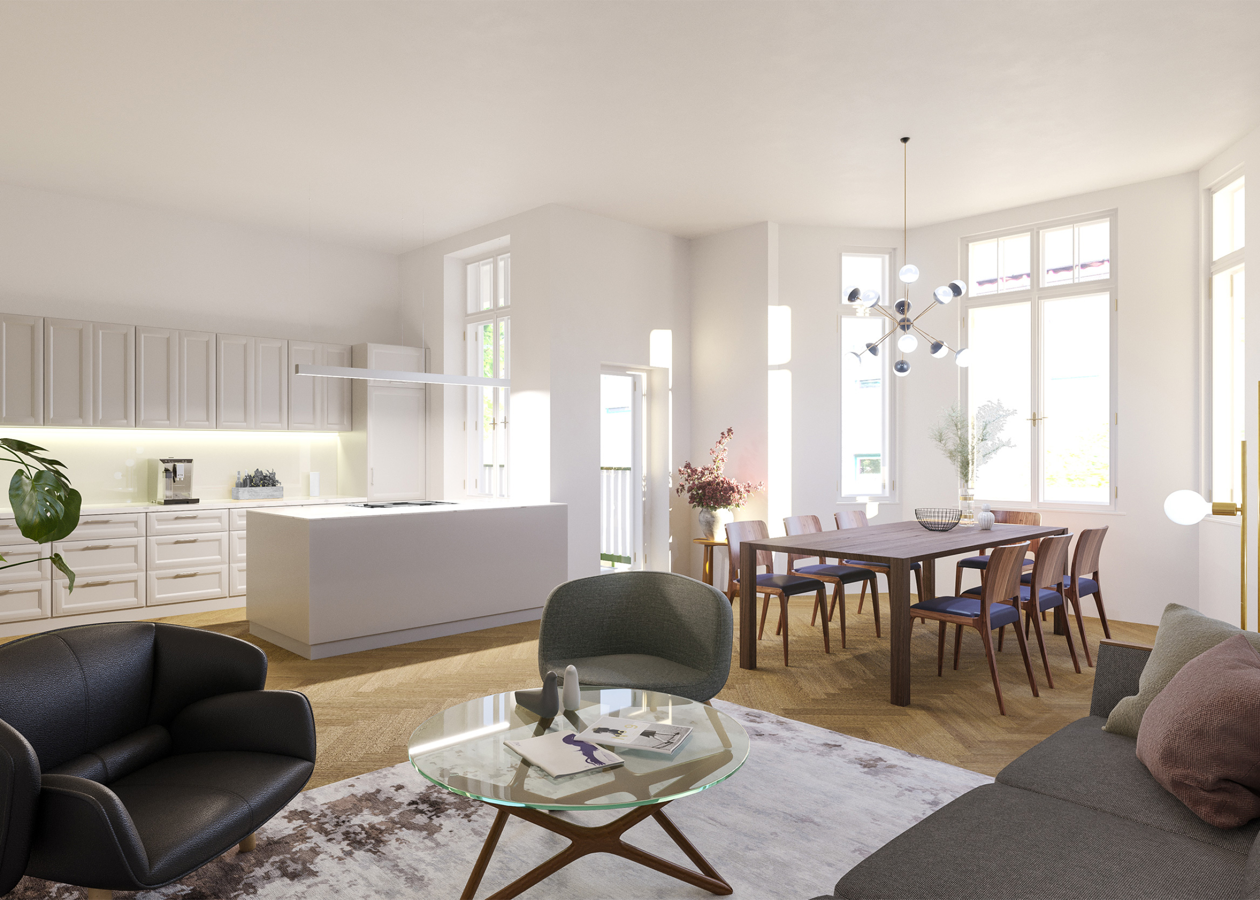 Für diese imposante Residenz wurde ein freundliches und einladendes Marketingkonzept gestaltet. Auch wurde ein individuelles Interiordesign inklusive hochwertigen 3D-Visualisierungen erstellt.
